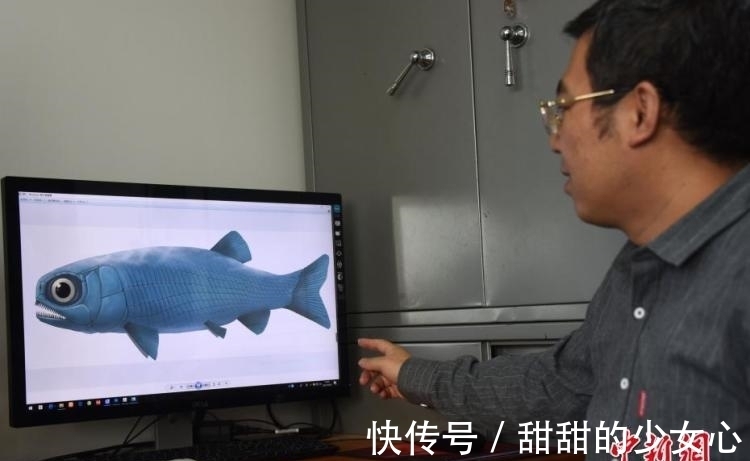 徐光辉研究员展示介绍亚洲肋鳞裂齿鱼复原图。